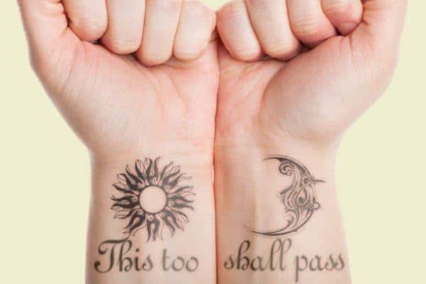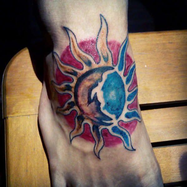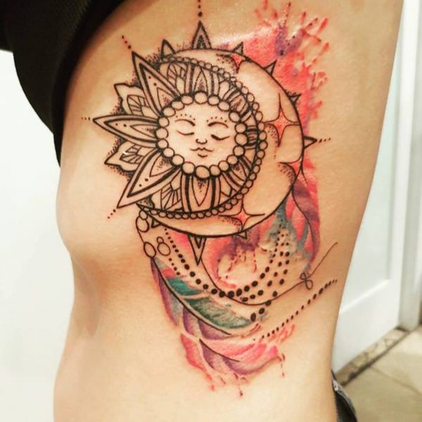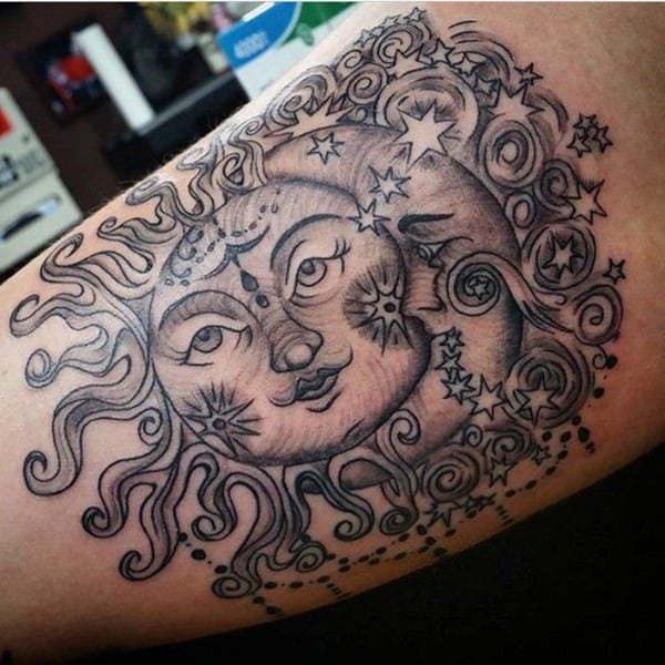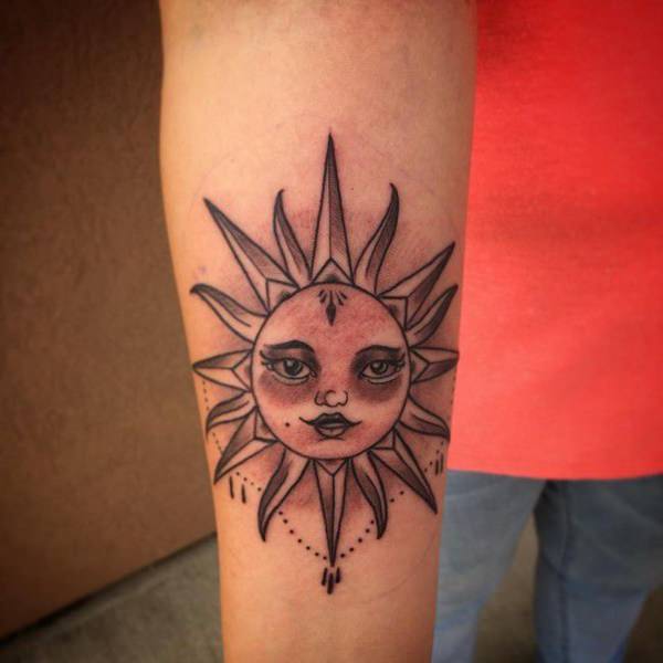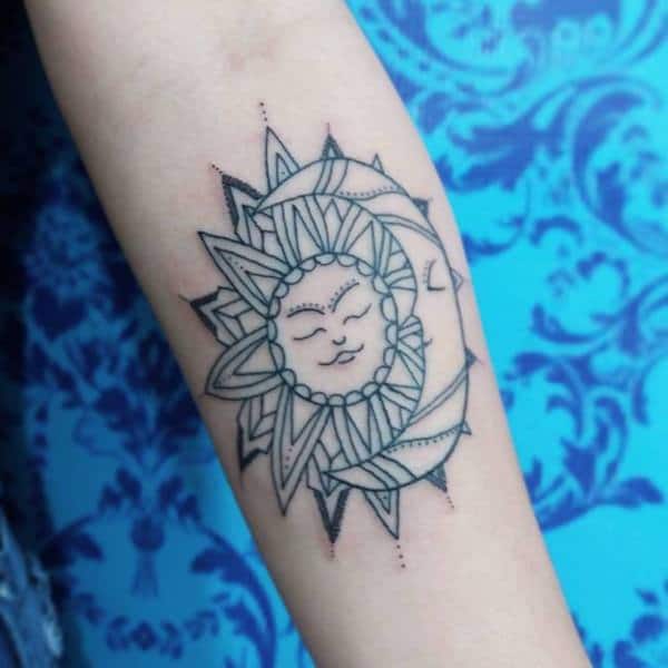 • By far, this is one of the most popular sun tattoos today. Although a sun alone can express many messages, the addition of the moon makes the meaning of the tattoo deeper. This tattoo can have different meanings, but it generally speaks about unity between two different things. The sun lights the Earth during the day, while the moon brightens the night sky. The Moon rises while the Sun Sets. Just like the sun and the moon, humans have two opposite personalities, the good and the bad. This tattoo is more like a message to the rest of the world that you are ready to embrace both your good and bad sides. However, it’s not only applicable to one person alone. Actually, this meaning can also be associated with lovers who embrace their differences without too much trouble.