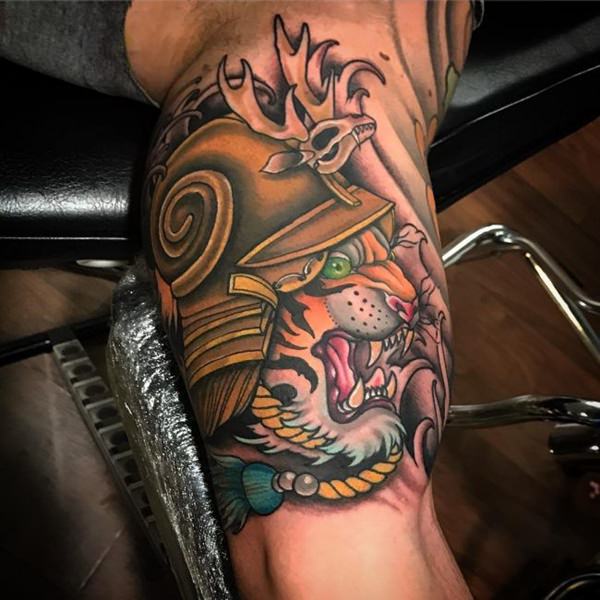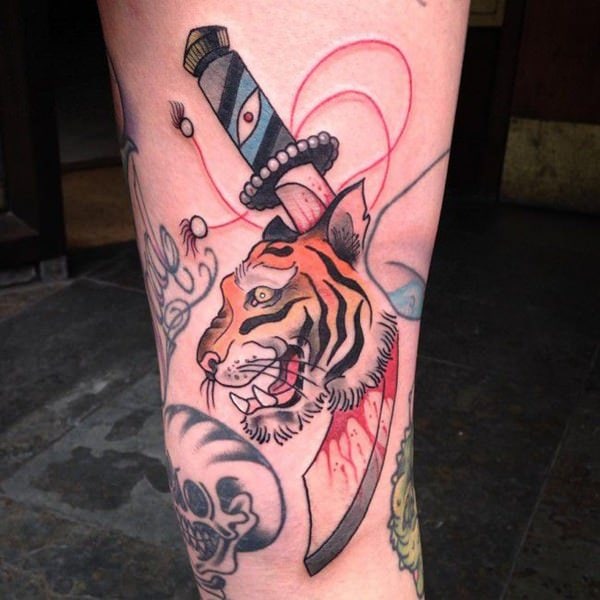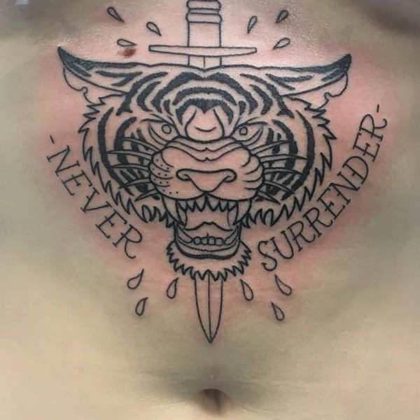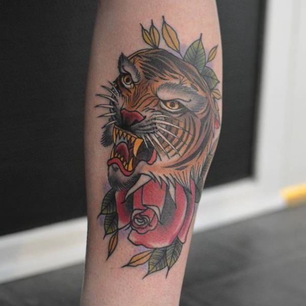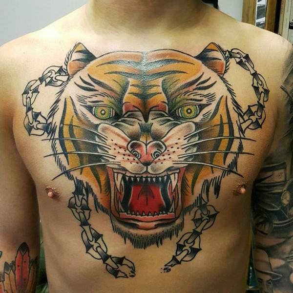 This crowned tiger tattoo is another perfect choice if you want to go for something more royal and powerful. This tattoo includes a colored inked tiger’s face wearing royal jeweled crown inked in red and other colors. This tattoo speaks out royalty and symbolizes power and authority.