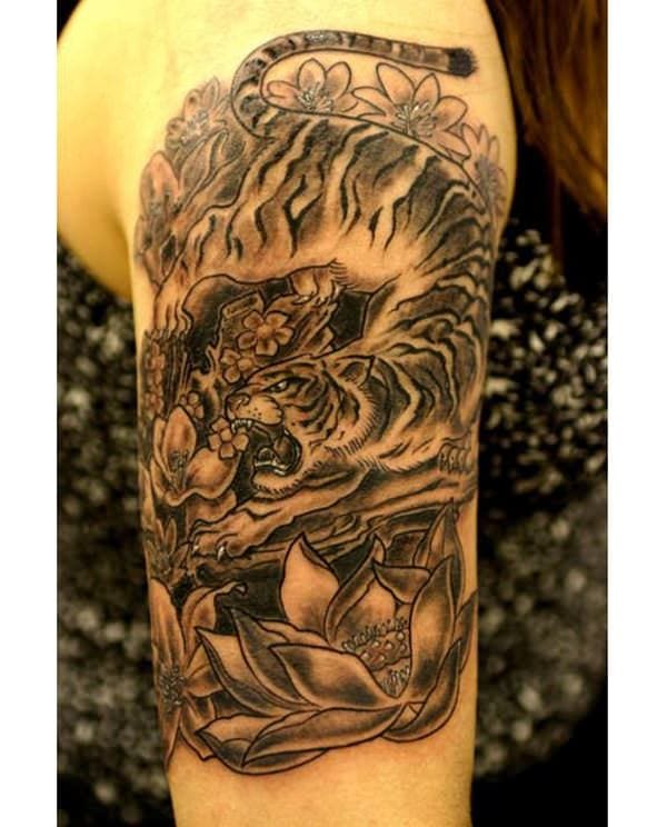 You can try out this unique tiger with flowers tattoo and achieve a beautiful representation of a tiger in your tattoo. The tattoo includes a black, grey, and brown inked tiger’s body with different flowers all over the tiger. In this tattoo, the tiger looks as if it’s chasing something with a furious and fierce look. The shading in this tattoo pops out the realistic feature.