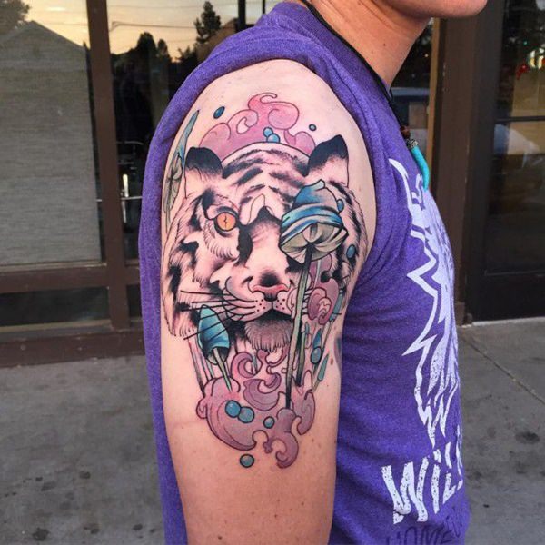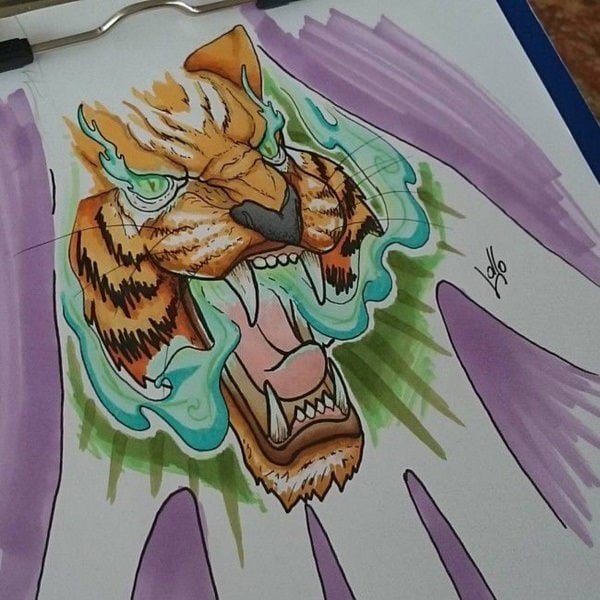 This tattoo includes the face of a tiger outlined in black ink and filled with different watercolors like yellow and sea green. You can change the colors or make it more attractive by adding more watercolors or a different combination.