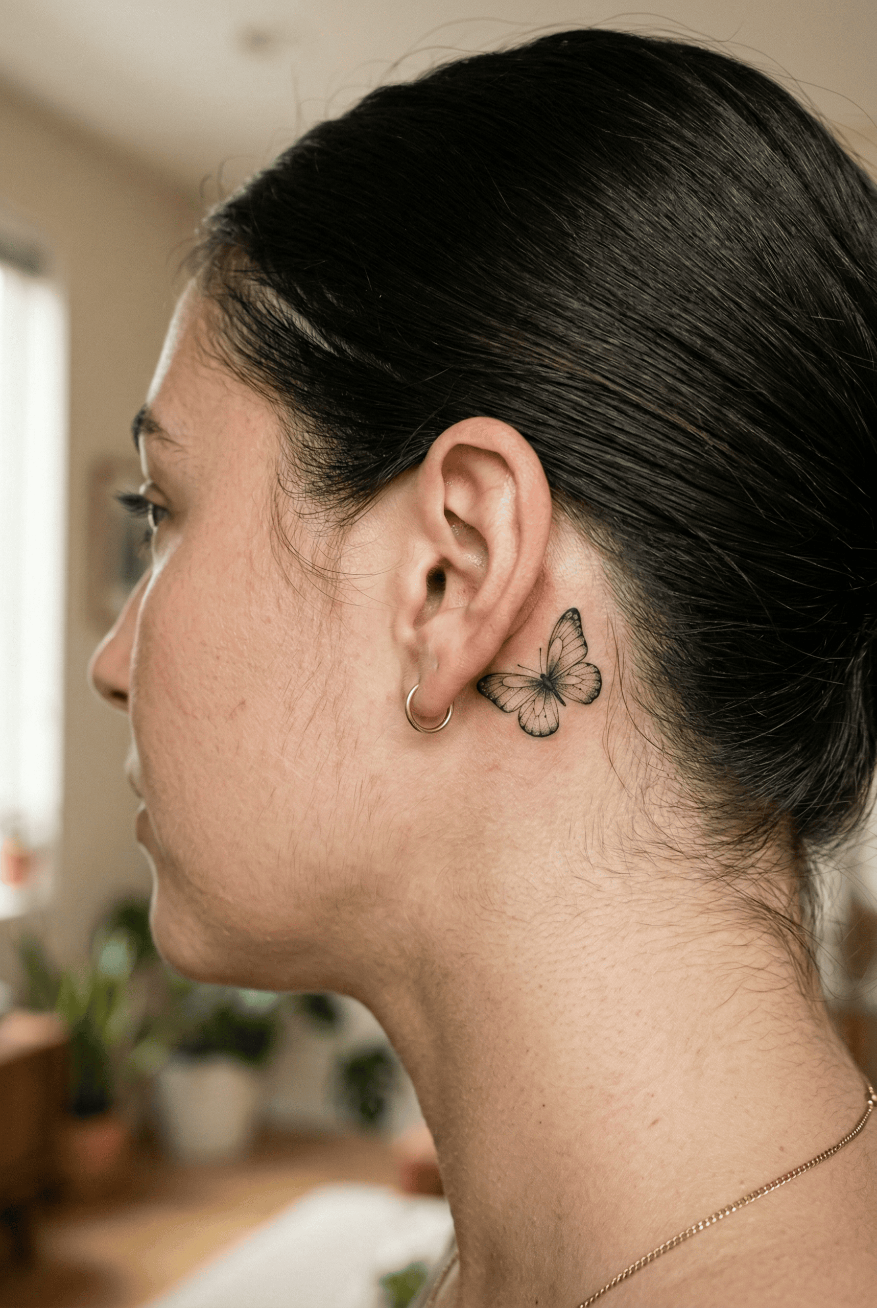 A butterfly behind the ear tattoo gives a feminine vibe, which is ready to be free and on its own.