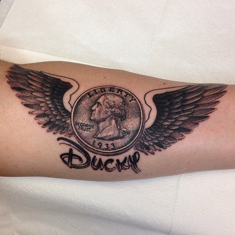 This tattoo includes the face of Benjamin, which you will find on all American dollar notes that help you to earn and buy something. This tattoo includes the full face of Benjamin with a few coins and dollar signs around and includes black and grey ink with some heavy detailing. This tattoo signifies a few things, such as it represents power and realism. These are the two most essential elements that a person looks up to, and if you want to feel these two things dial, you should definitely get this tattoo. Many people get this tattoo taking inspiration from the famous movie ‘The Town,’ which is about bank-robbing. The perfect place for you to get this tattoo would be on your arm.